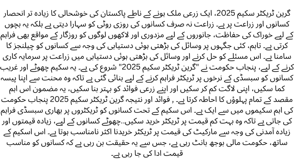 Green Tractor Scheme 2025 ,Being a agricultural country, the majority of Pakistan’s prosperity depends on farmers and agriculture. Agriculture not only supports the livelihood of farmers, it also provides food safety for children, labour for animals and employment opportunities to millions of people. However, farmers face challenges due to increased resource availability in many places. To solve this issue and to invest agriculture in increased resource availability, Punjab government has launched “Green Tractor Scheme 2025”.This scheme has been created to provide tractors to small and poor farmers on subsidy rates so that they can earn their own money through hard work, reduce their costs and improve their agricultural benefits This article covers the all aspects of this shceme like objectives , key features ,eligibility crieteria , benefits , and conclusion Green Tractor Scheme 2025 is one of the important schemes of Punjab Government. Under this scheme, farmers are provided heavy subsidy on tractors so that they can buy tractor at very low price..For small farmers, buying a tractor at market price is often inappropriate due to high prices and high income. With this scheme, the government is sharing financial burden, making it a reality that farmers are pay affordable prices.