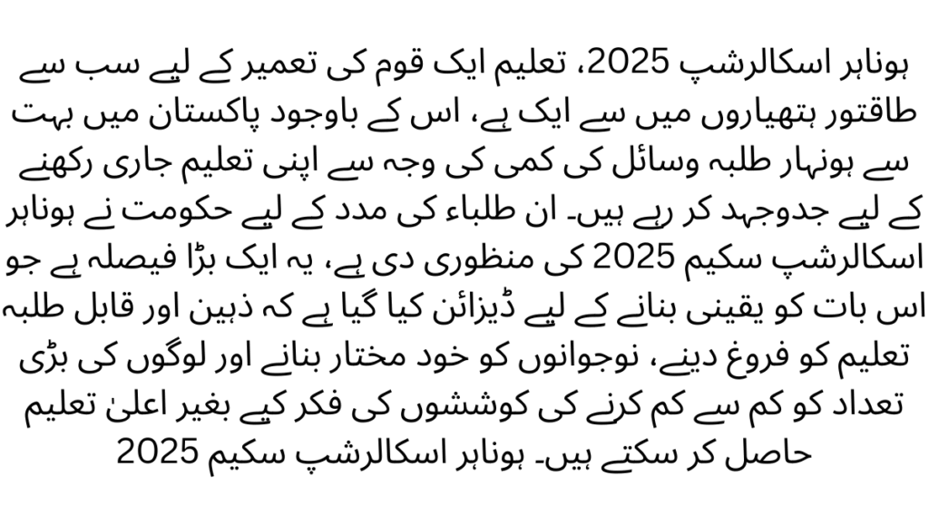 Honahar Scholorship 2025, Education is one of the most powerful weapons to build a nation , despite this many talented students in Pakistan are struggling to continue their education due to lack of resources. To help these students, the government has approved the Honahar Scholarship Scheme 2025, this is a big decision which has been designed to make this thing certain that intelligent and capable students can acquire higher education without worrying about the majority attempts to promote education, make the youth independent and reduces the mass of people to a minimum.This schemeIn this article, we will discuss the important features, advantages, benefits of the application and its beneficial effects of Honahar Scholarship Scheme 2025