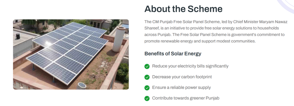 The CM Punjab Free Solar Panel Scheme is a government initiative launched by Chief Minister Maryam Nawaz Sharif to provide 100,000 free rooftop solar systems to low-income households in Punjab. It aims to reduce electricity costs, promote renewable energy, and improve energy independence.