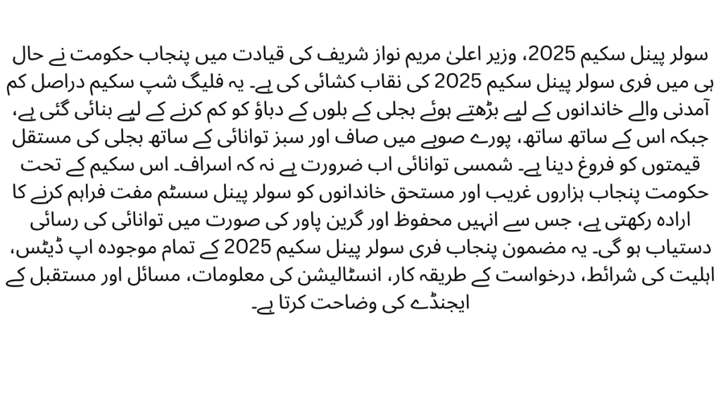 The Punjab Free Solar Panel Scheme 2025 is a government initiative launched by CM Maryam Nawaz to provide free solar panel systems to low-income households consuming 100–200 units of electricity per month.