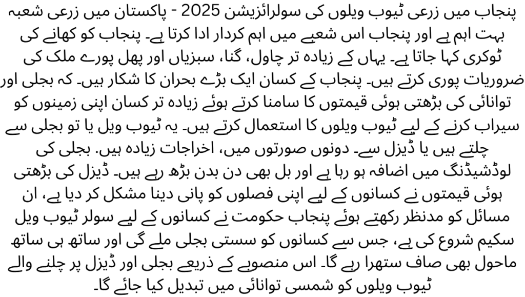 Solarisation of Agricultural Tube-Wells in Punjab 2025 –The agriculture sector is very important in Pakistan and Punjab plays an important role in this sector. Punjab is called the food basket. Most of the rice, sugarcane, vegetables and fruits here meet the needs of the entire country. The farmers of Punjab are facing a major crisis. that facing the rising cost of electricity and energy, most farmers use tube wells to irrigate their lands. These tube wells run either on electricity or on diesel. In both cases, the costs are higher. The load-shedding of electricity is increasing and the bills are also increasing day by day. Rising diesel prices have made it difficult for farmers to water their crops.Considering these problems, the Punjab government has launched a solar tube well scheme for farmers, which will provide farmers with cheap electricity and at the same time keep the environment clean. Through this project, tube wells running on electricity and diesel will be converted to solar energy.